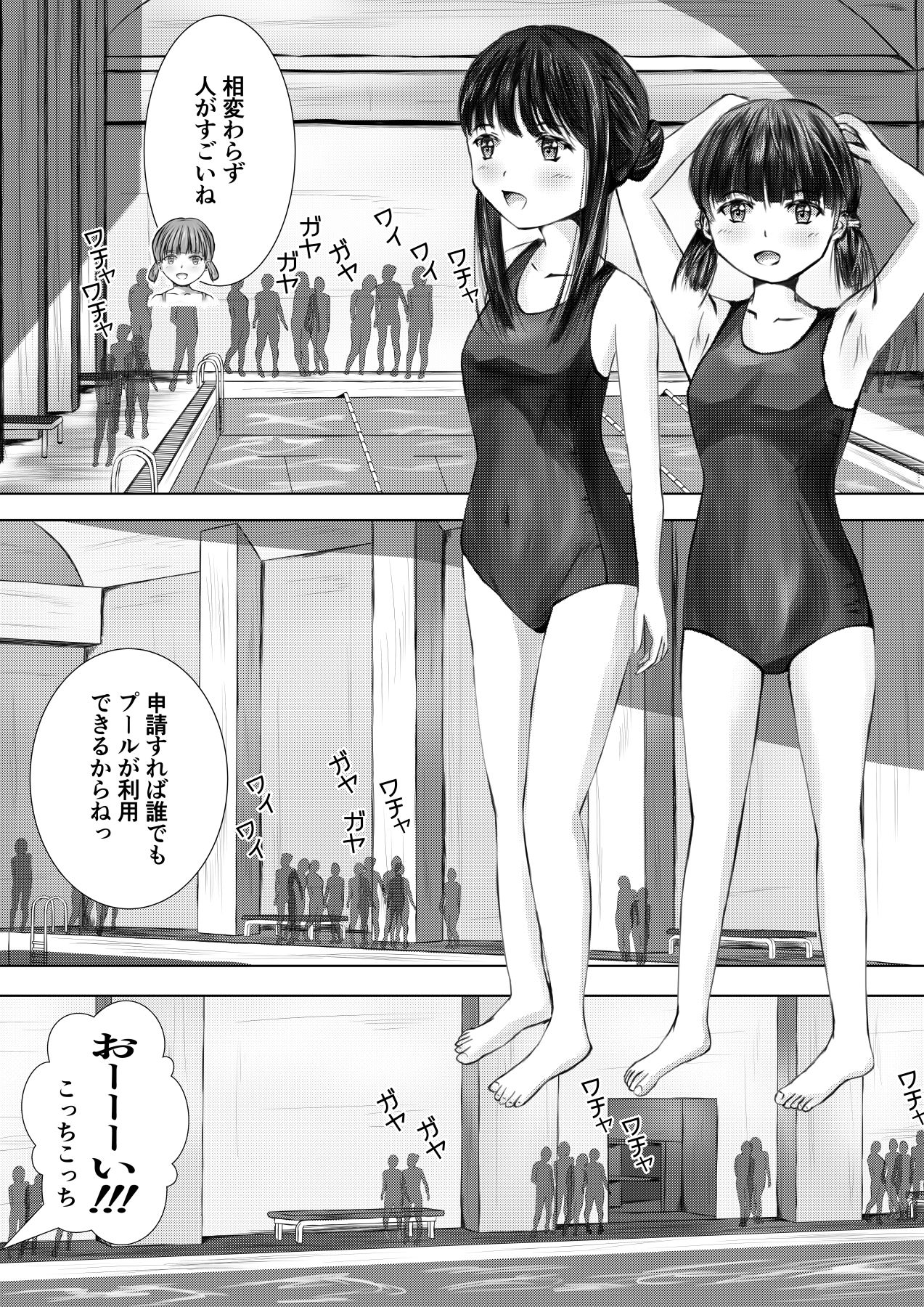スクール水着に着替えて友達とワイワイガヤガヤ。